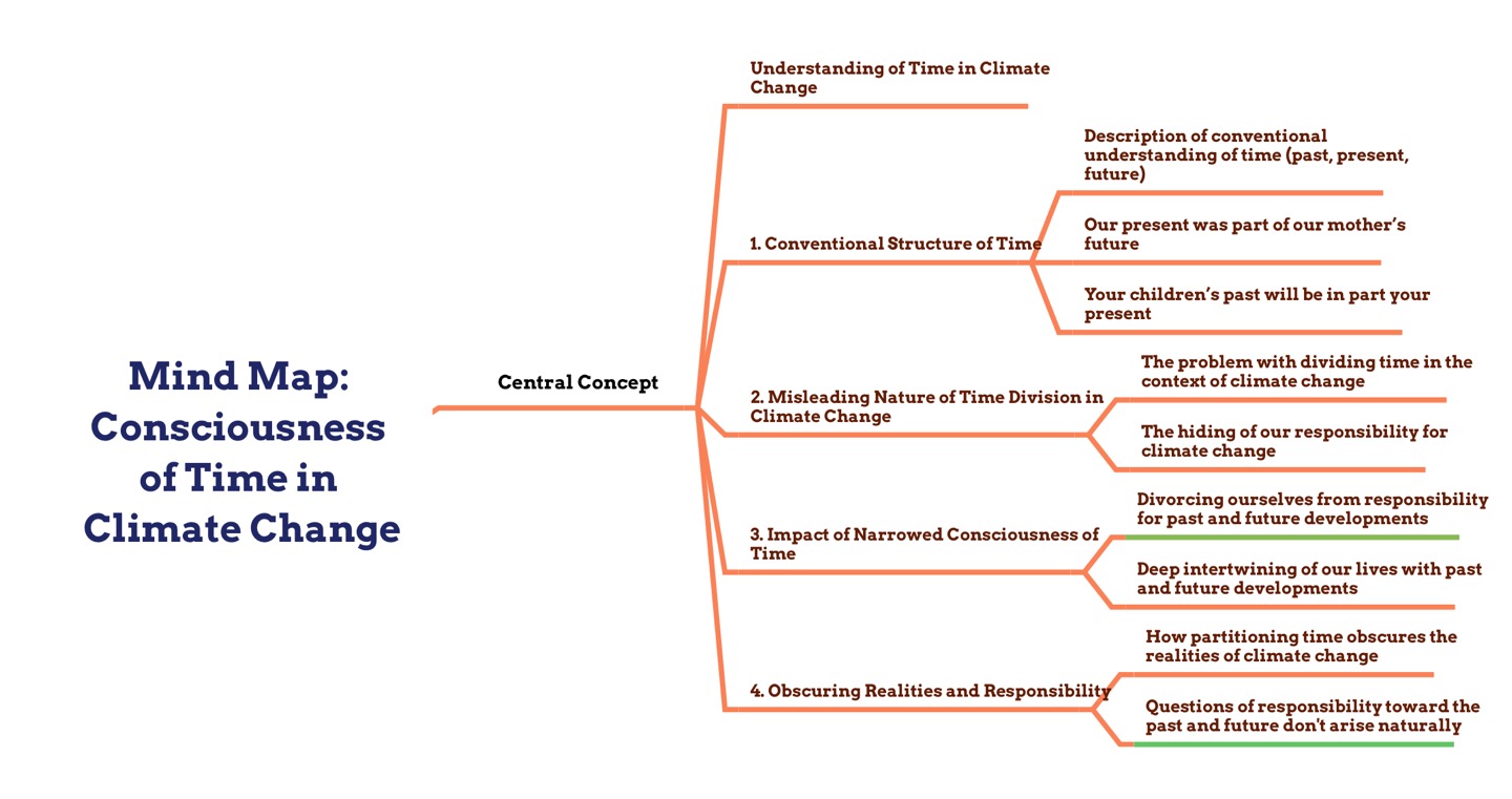 이 문제는 기후 변화의 맥락에서 시간에 대한 인식 및 시간과의 관계와 관련하여 복잡한 개념에 대한 깊은 이해가 필요하기 때문에 꽤 난이도가 높은 상급 수준의 문제입니다.