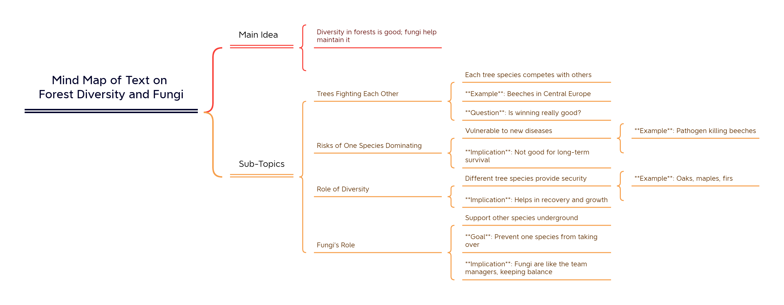 나는 균류가 자신의 더 큰 상대보다 조금 더 앞서 '생각한다'고 짐작한다. 나무들 사이에서 각 종은 다른 종들과 싸운다. 중부 유럽 태생의 너도밤나무가 그곳의 숲 대부분에서 우세하게 나타날 수 있다고 가정해 보자. 이게 정말 이점일까? 만약 대부분의 너도밤나무를 감염시켜 죽게 만드는 새로운 병원균이 나타나면 어떻게 될까? 그런 경우, 주변에 참나무, 단풍나무 또는 전나무와 같은 일정한 수의 다른 종이 계속 자라서 새로운 세대의 어린 너도밤나무가 싹을 틔우고 자라는 데 필요한 그늘을 제공한다면 더 유리하지 않을까? 다양성은 오래된 숲에 안전을 제공한다. 균류도 또한 안정적인 조건에 매우 의존하기 때문에, 그들은 한 종의 나무가 우세해지지 않도록 확실히 하기 위해 땅 속에 서 다른 종을 지원하고 그것들을 완전한 붕괴로부터 보호한다.