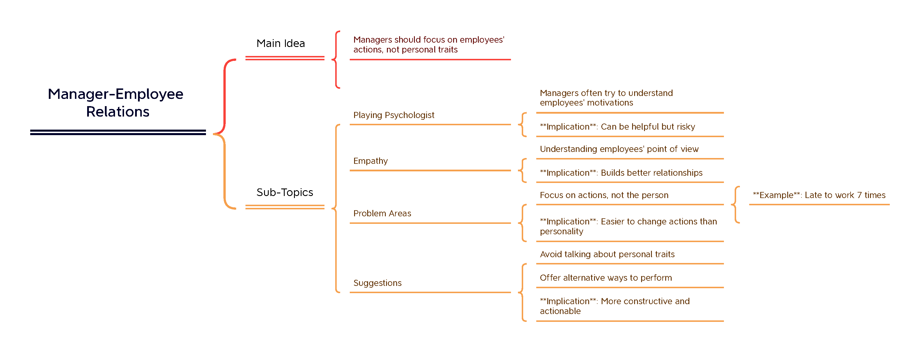 관리자들은 직원이 왜 특정한 방식으로 행동했는지를 '파악하기' 위해 심리학자 역할을 하려고 자주 노력한다. 그들의 관점을 이해하기 위해 직원들과 공감하는 것은 매우 도움이 될 수 있다. 하지만, 특히 문제 영역을 다룰 때, 그것은 잘하지 못하는 사람이 아니라 근무 중에 보여지는 행동이라는 것을 기억하라. 직원들에게 그들이 바꿔야 할 인격적 특성에 대해 제안하는 것을 피하라. 대신에 더 용인되는 수행 방법을 제안하라. 예를 들어, 관리자는 어떤 사람의 '신뢰할 수 없음'에 초점을 맞추는 대신, 그 직원이 '이번 달에 회사에 일곱 번 지각했다'는 사실에 초점을 맞출 수도 있을 것이다. 직원들은 자신이 어떤 사람인지를 바꾸기는 어렵 다. 일반적으로 자신이 행동하는 방식을 바꾸기가 훨씬 쉽다.