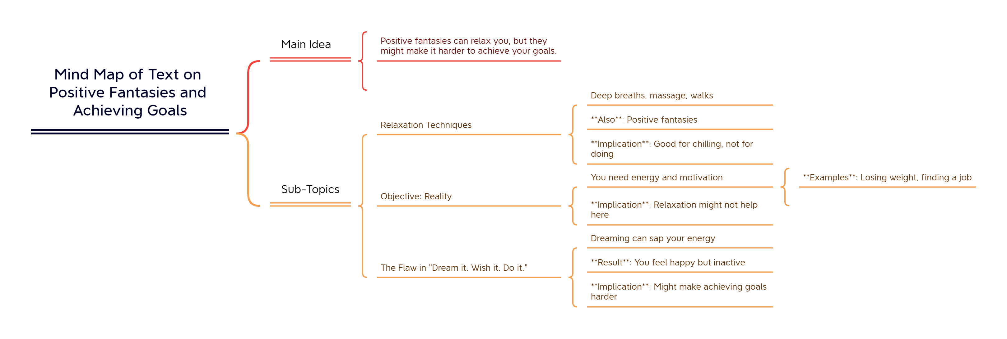 낙관적인 상상이 생리학적 검사에서 나타날 정도로 우리가 긴장을 푸는 데 도움이 된다는 것은 주목할 만하다. 만약 여러분이 긴장을 풀고 싶다면, 심호흡하거나, 마사지를 받거나, 산책을 할 수도 있지만, 단순히 눈을 감고 여러분이 누릴 지도 모를 미래의 결과에 대해 상상해 볼 수도 있 다. 하지만 여러분의 목표가 소망을 실현하는 것인 경우라면 어떨까? 여러분이 '가장 피해야 할' 상태는 긴장이 풀려 있는 것이다. 여러분은 소파에서 일어나 체중을 감량하거나 직업을 찾거나 시험공부를 할 수 있을 만큼 충분히 활력을 얻어야 하고, 피할 수 없는 장애물이나 문제가 발생할 때도 계속 전념할 수 있도록 충분히 동기부여 되어야 한다. '그것을 꿈꿔라. 그것을 소망하라. 그것을 실행하라.'라는 원칙은 사실이 아니며, 우리는 이제 그 이유를 안다. 그것을 꿈꾸는 중에, 여러분은 그것을 하는데 필요한 에너지를 약화시킨다. 여러분은 스스로를 완전한 행복, 고요, 그리고 비활동의 일시적인 상태에 빠지게 한다.
