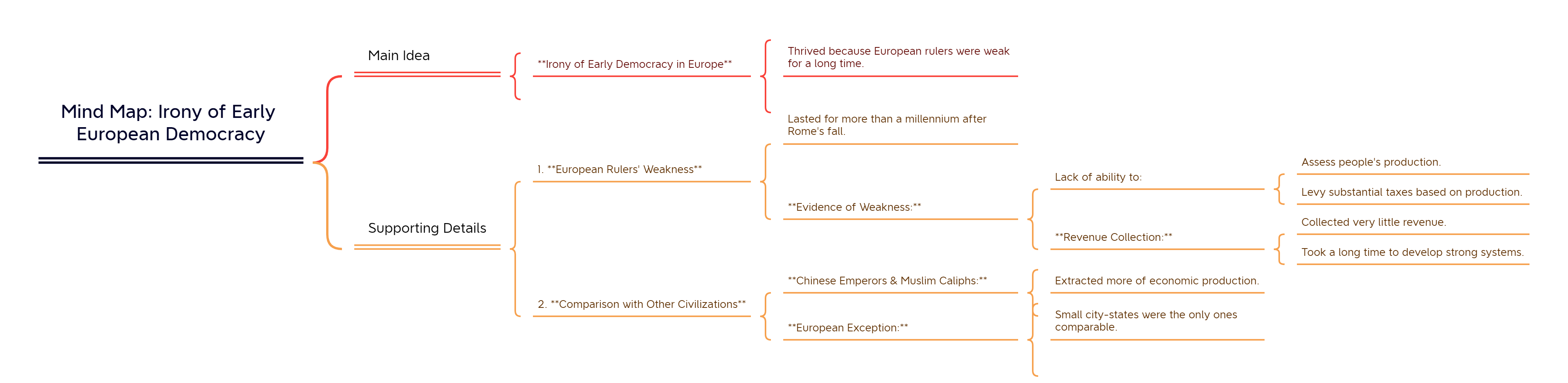 유럽 초기 민주주의의 아이러니는 바로 유럽의 통치자들이 매우 오랫동안 현저하게 약했기 때문에 그것이 번성하고 번영했다는 것이다. 로마의 멸망 후 천년 넘게, 유럽의 통치자들은 백성들이 생산하고 있었던 것을 평가하고 이를 바탕으로 상당한 세금을 부과할 능력이 부족했다. 유럽의 약함을 설명하는 가장 눈에 띄는 방법은 그들이 거둔 세입이 얼마나 적은지를 보여주는 것이다. 유럽인들은 결국 강력한 세입 징수 시스템을 개발했지만, 그렇게 하는 데는 엄청나게 오랜 시간이 걸렸다. 중세와 초기 근대의 일부 동안, 중국의 황제들과 이슬람 문명의 칼리프들은 작은 도시 국가들을 제외한 어떤 유럽 통치자들보다 경제적 생산물에서 훨씬 더 많은 것을 얻어낼 수 있었다.