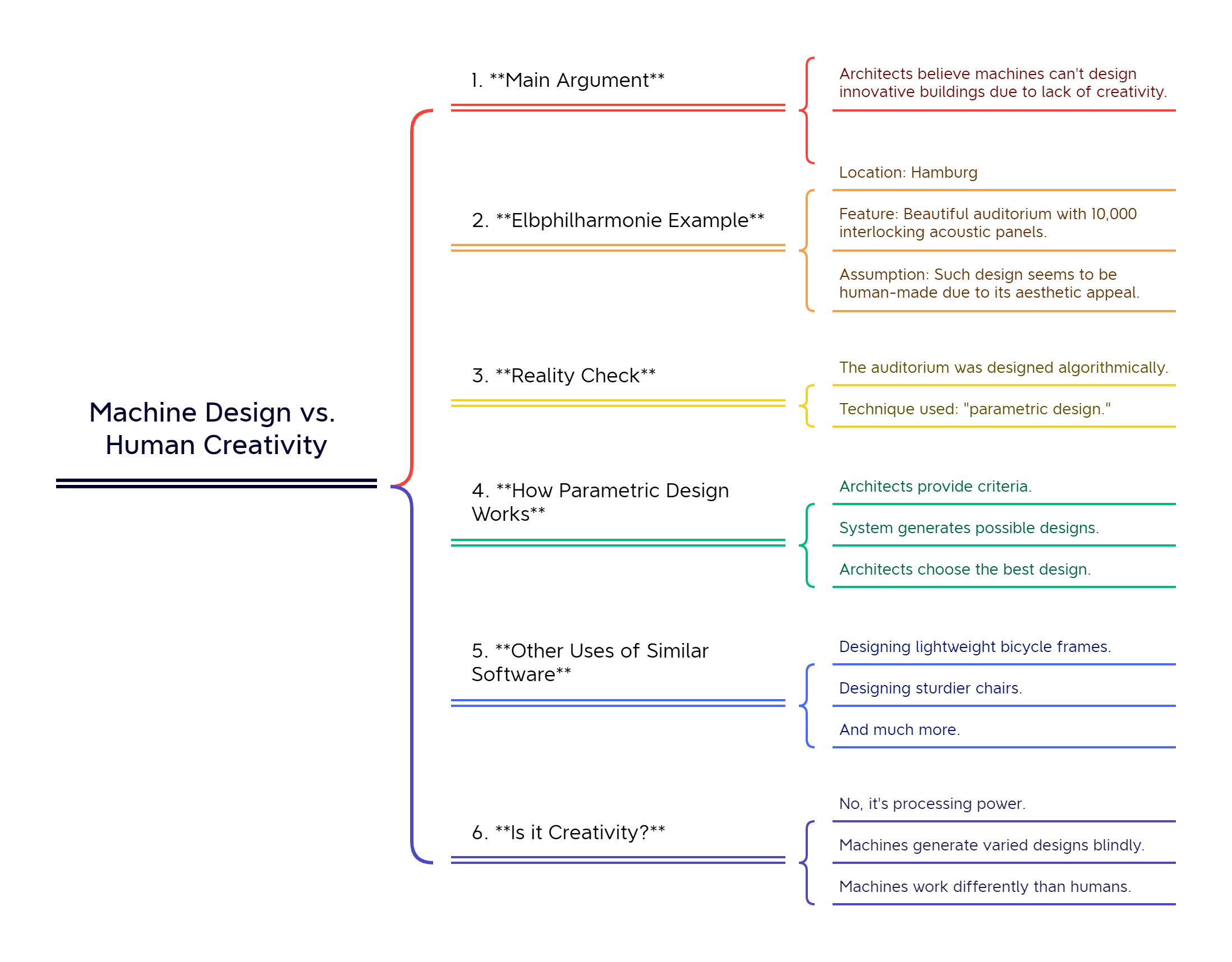 건축가들은 컴퓨터가 '창의적'일 수 없기 때문에 기계는 결코 혁신적이거나 인상적인 건물 을 디자인할 수 없다고 말할지도 모른다. 그러나 Hamburg에 있는, 1만 개의 서로 맞물리는 음향 패널로 구성된 놀랍도록 아름다운 강당을 포함하는 새로운 콘서트 홀인 Elbphilharmonie를 생각해 보라. 그것은 인간만이, 그리고 그것도 놀랍도록 세련된 창의적 감수성을 가진 인간만이, 그토록 미적으로 인상적인 것을 디자인할 수 있다고 본능적으로 생각하게 만드는 종류의 공간이다. 그러나 실제로 그 강당은 '파라메트릭 디자인'이라고 알려진 기술을 사용하여 알고리즘에 의한 방식으로 디자인되었다. 건축가들은 그 시스템에 일련의 기준을 부여했고, 그것은 그 건축가들이 선택할 수 있는 일련의 가능한 디자인을 만들어냈다. 유사한 소프트웨어가 다른 많은 것들 중에서도 경량 자전거 프레임과 더 튼튼한 의자를 디자인하는 데 사용되어 왔다. 이러한 시스템들은 '창의적으로' 작동하고 있는가? 아니다, 그것들은 인간과는 매우 다른 방식으로 작동하면서 다양한 가능한 디자인을 닥치는 대로 만들기 위해 많은 처리 능력을 사용하고 있다.
