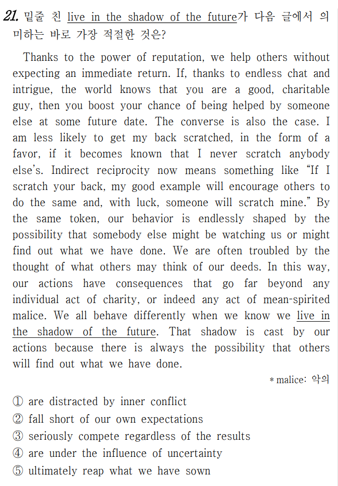 (2) "We all behave differently when we know we live in the shadow of the future." (우리 모두 미래의 그림자에서 산다는 것을 알고 있을 때 다르게 행동합니다.)