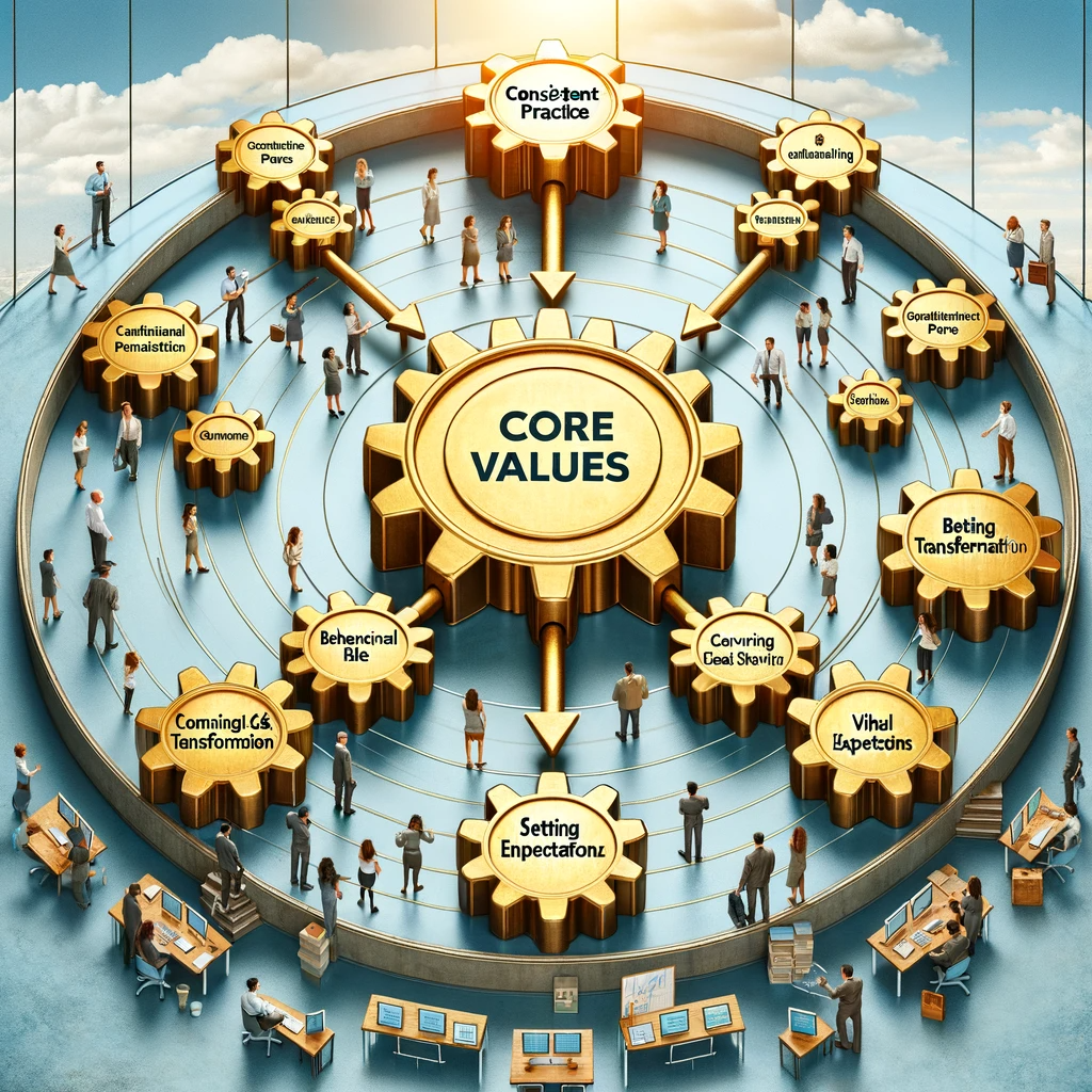 가치가 조직 문화로 변화하는 과정을 보여주는 개념도입니다. '핵심 가치', '일관된 실천', '행동 변화' 등의 핵심 측면이 표시된 톱니바퀴가 서로 맞물려 있는 모습을 보여줍니다. 각 요소는 서로 연결되어 있으며, 상호 의존성과 핵심 가치에서 통합된 가치 중심 문화로의 흐름을 강조합니다. 이 다이어그램은 명확성과 목적을 상징하는 배경을 배경으로 다양한 사람들이 협업하는 환경에서 이 개념을 구현하고 있습니다.