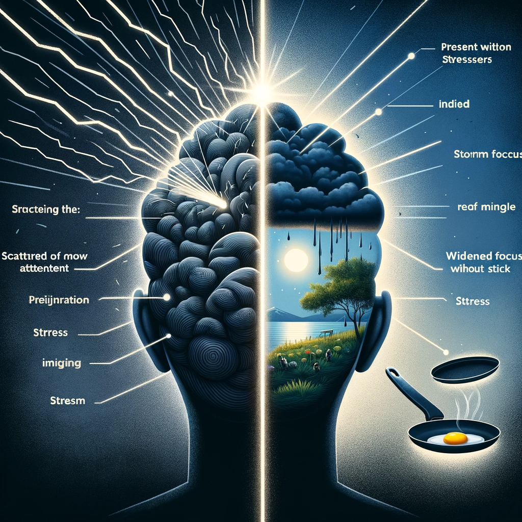 흩어진 집중과 좁은 집중: 분산된 주의는 역설적이게도 스트레스를 유발하는 경험의 측면에만 좁게 집착하는 경향이 있어 스트레스를 악화시킵니다.