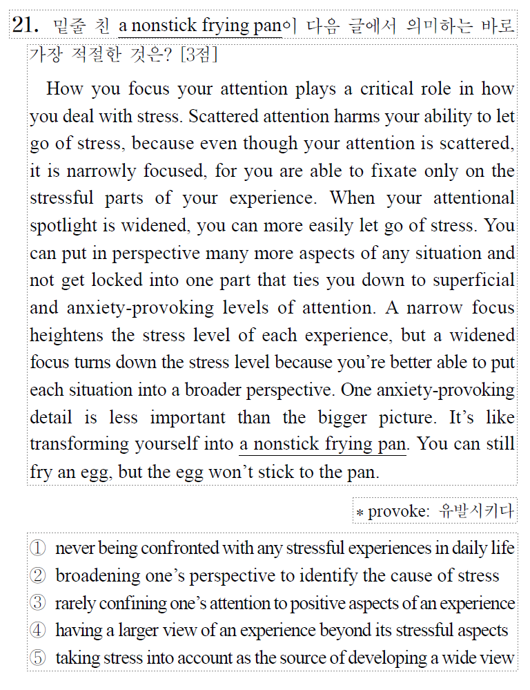 붙지 않는 팬의 비유: 여기서 말하는 아이디어는 스트레스가 '달라붙지 않도록' 하는 것입니다. 달걀이 달라붙지 않는 팬처럼, 시야를 넓히면 스트레스 요인이 지속적이고 스트레스를 주는 영향을 주지 않고도 존재할 수 있습니다.